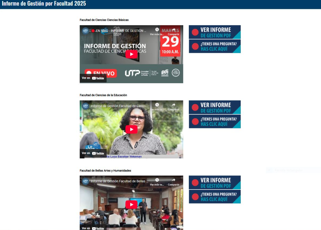 La invitación es para toda la comunidad universitaria -estudiantes, docentes, egresados y administrativos-, así como la ciudadanía en general a conocer el detalle de cada informe a través del video y la presentación disponibles en el portal rindecuentas.utp.edu.co. Allí también podrán dejar preguntas, comentarios o sugerencias mediante el formulario habilitado, las cuales serán atendidas oportunamente.